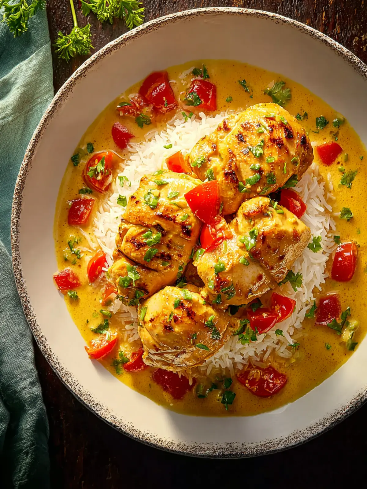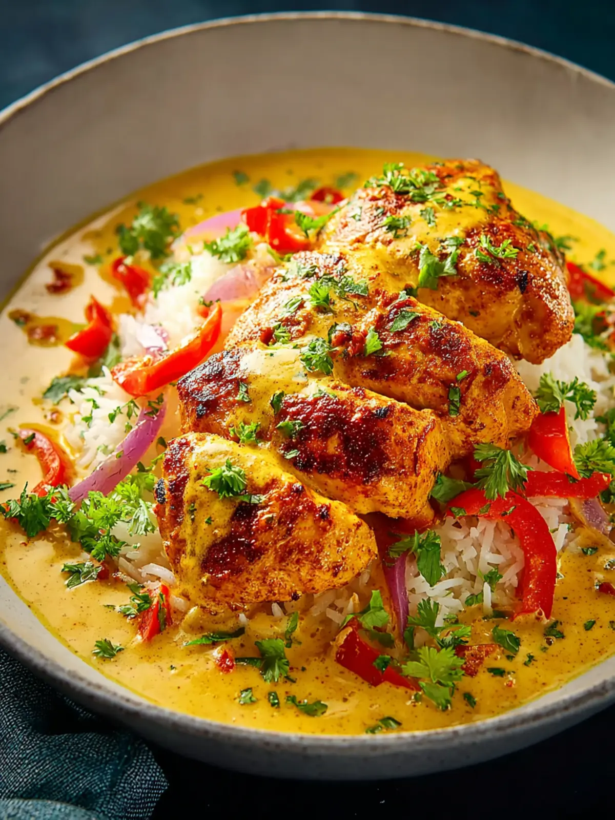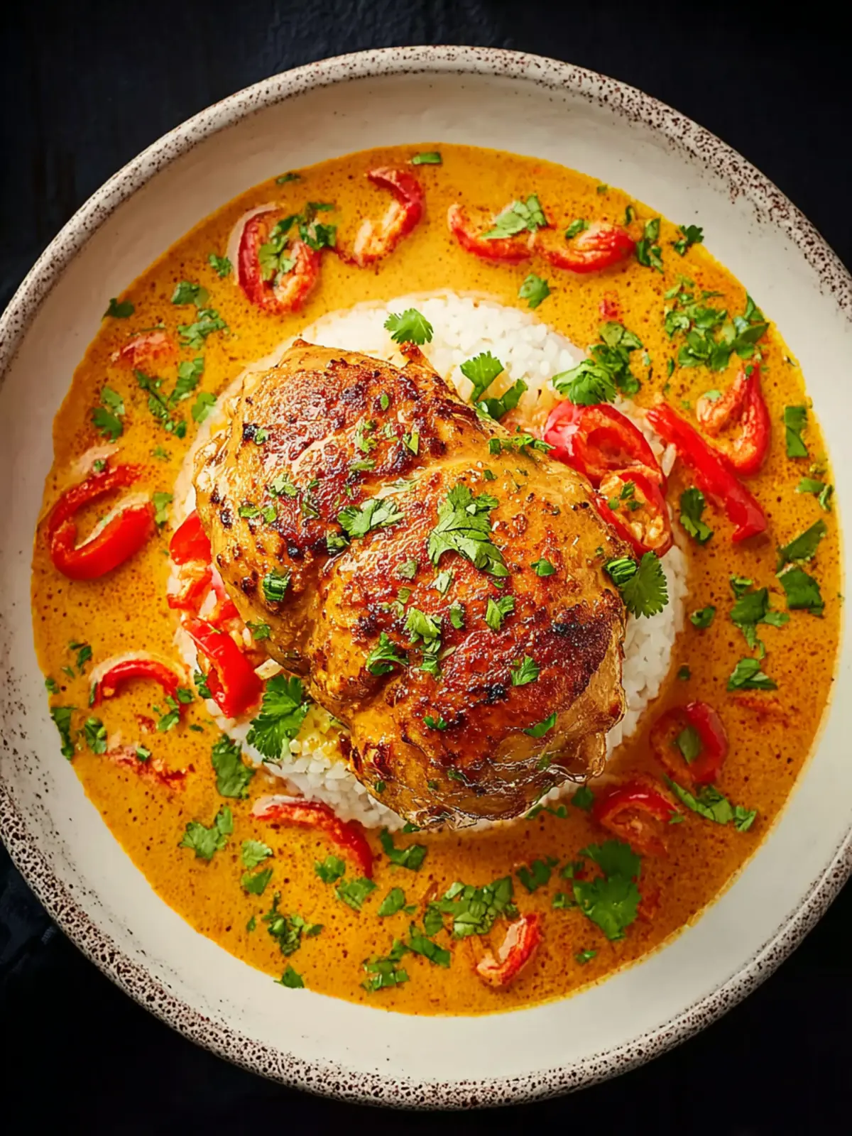 A delicious coconut curry dish featuring tender chicken thighs and vibrant vegetables.