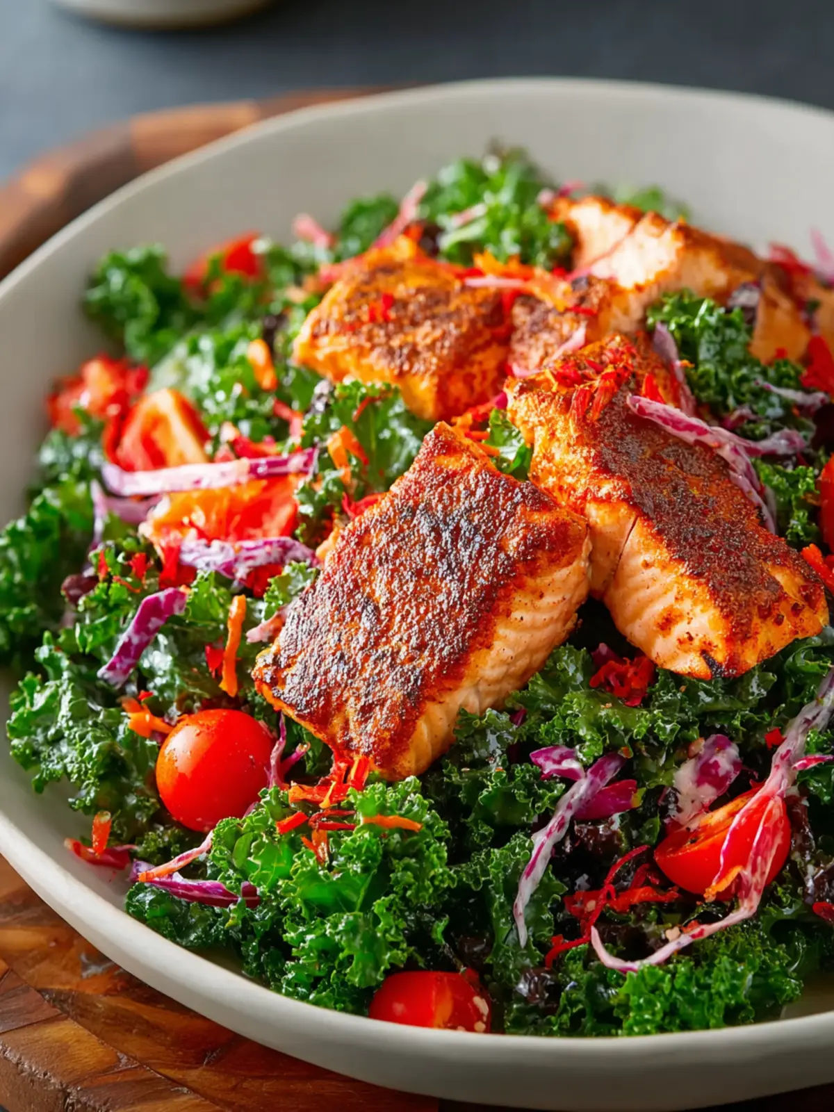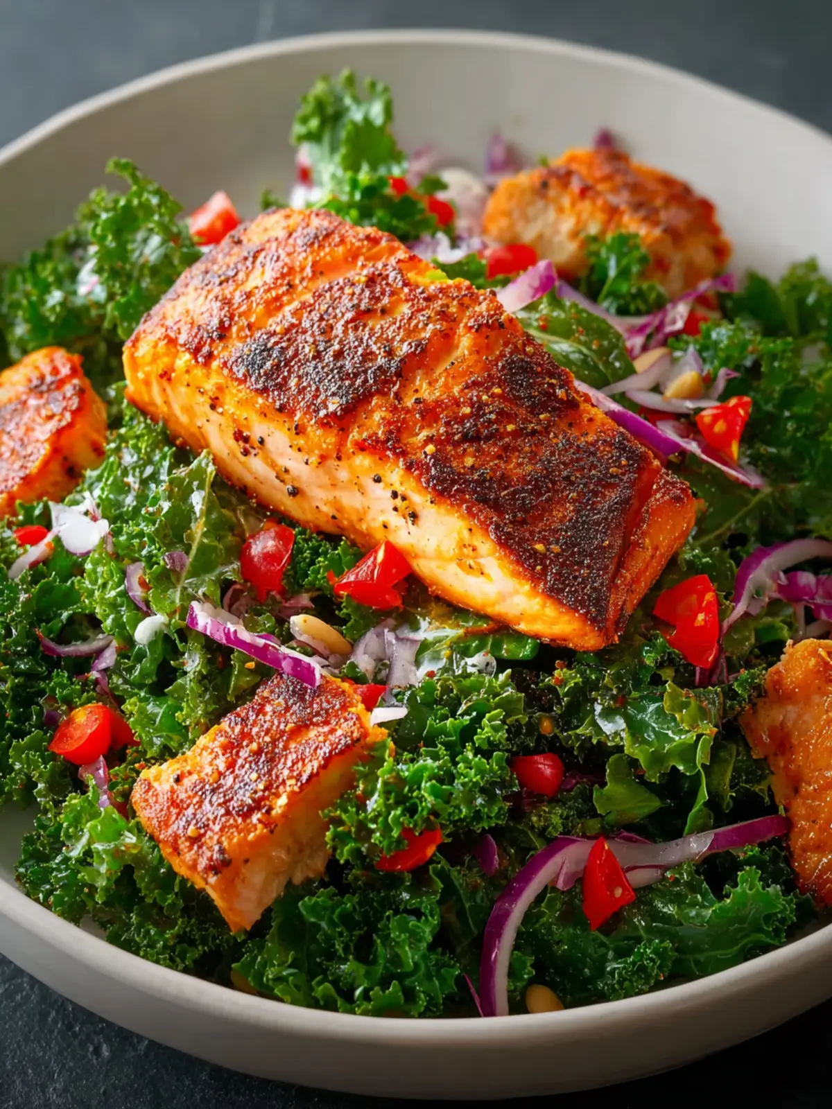 Kale, often hailed as a superfood, serves as the perfect base for this salad. Its sturdy leaves hold up beautifully against hearty toppings, ensuring that every bite is filled with nutrition and crunch. Paired with succulent, perfectly seasoned Cajun salmon, this recipe takes your standard salad and elevates it into something extraordinary.