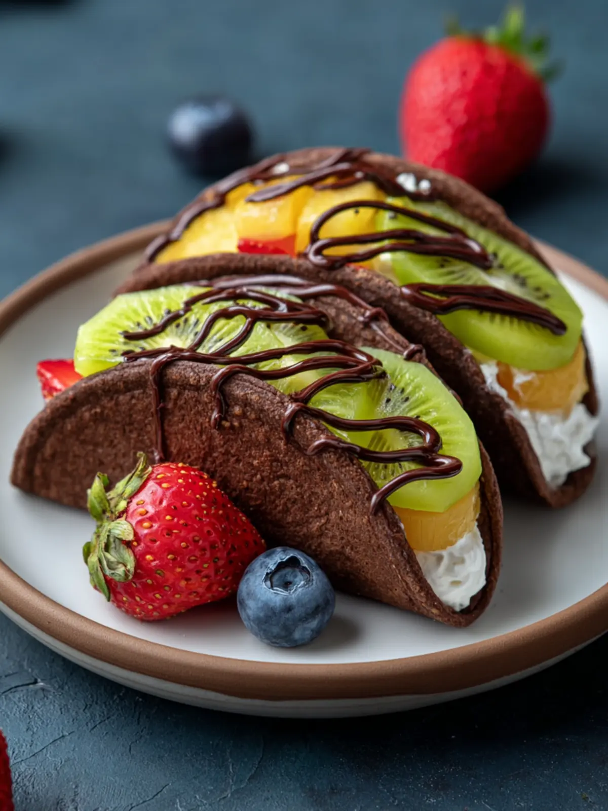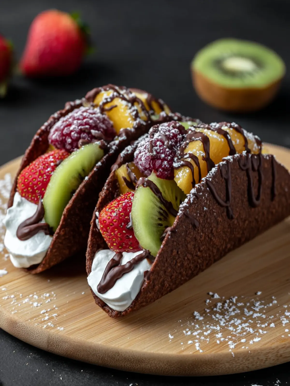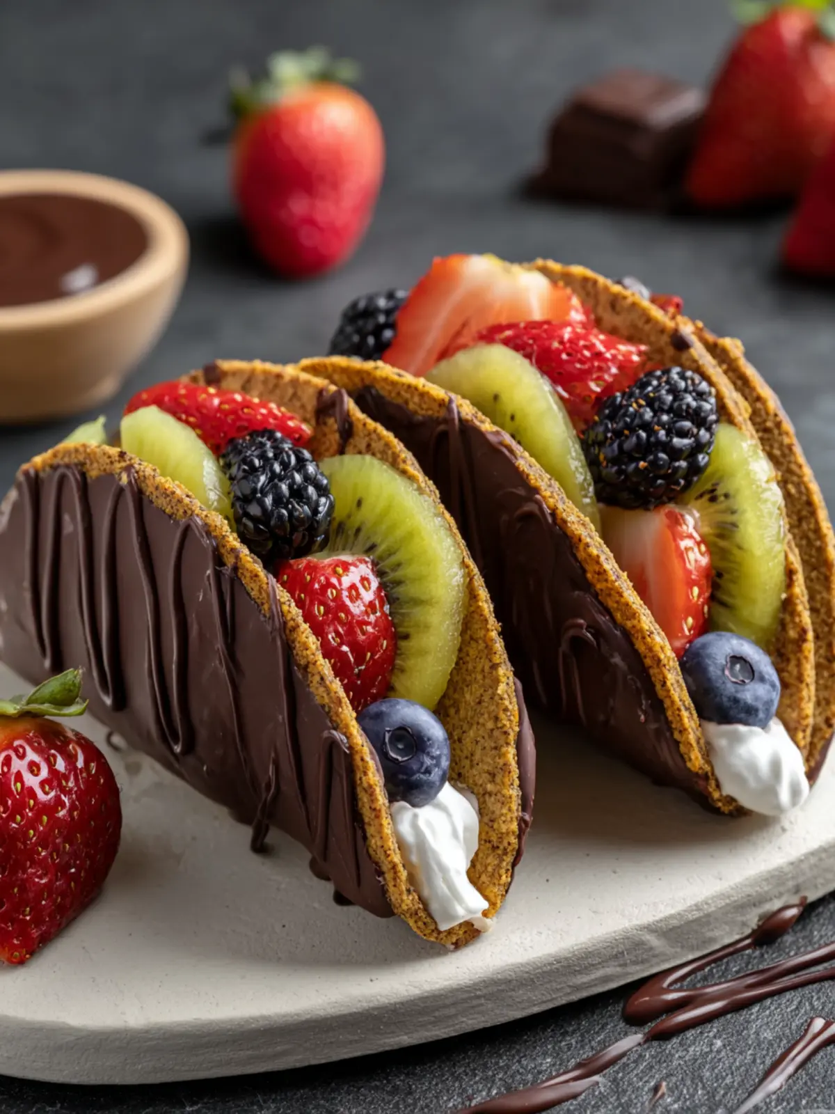 These elements come together to create a dish that is not only visually captivating but also a mouthwatering treat that’s sure to impress anyone lucky enough to take a bite. Whether you’re serving them at a party or enjoying them solo, chocolate dessert tacos with fruit are an unforgettable culinary experience.