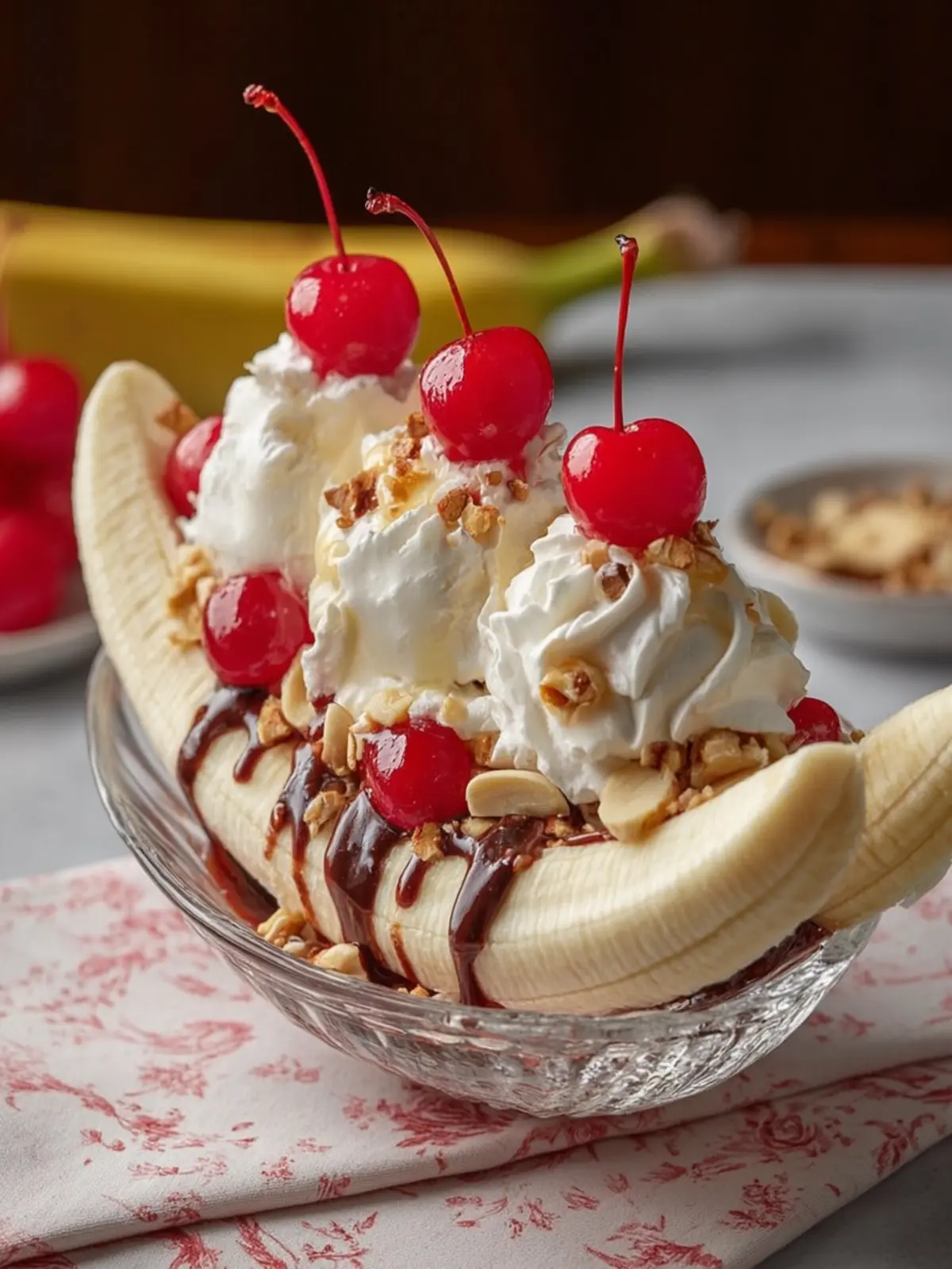 Maraschino cherries: No classic banana split is complete without the iconic maraschino cherries. These vibrant red cherries add a pop of color and a sweet contrast that ties the indulgence together.