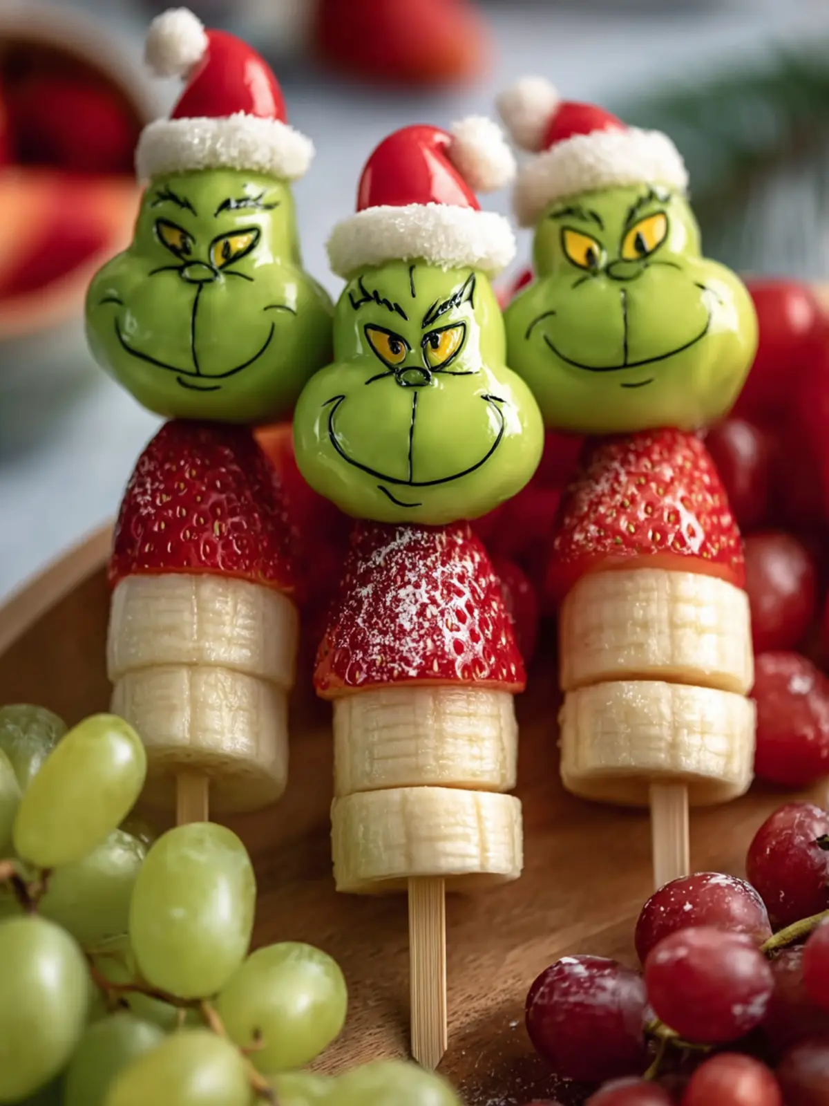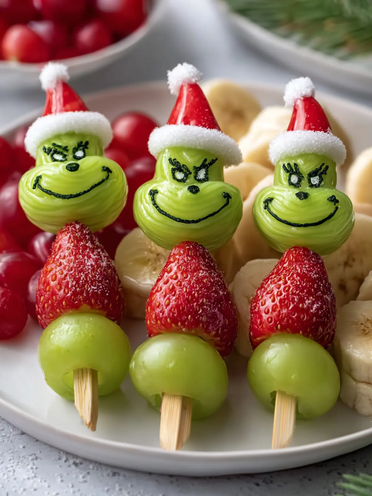 • Consider using different fruits or edible decorations for variation, such as sliced kiwi for the Grinch head or fluff from coconut flakes for hat trim.