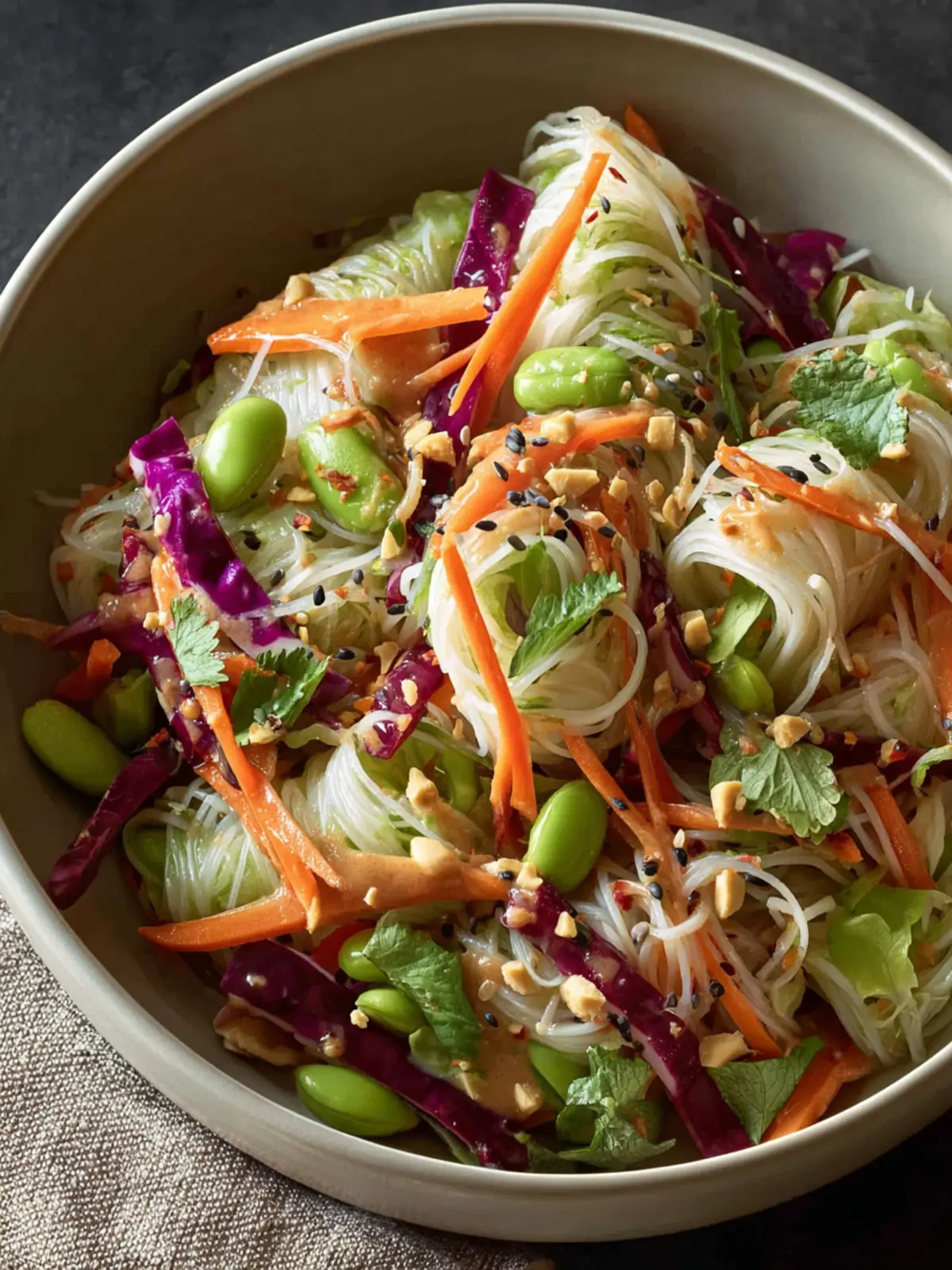 3. Combine the noodles, vegetables, herbs, edamame, and peanuts in a large bowl.