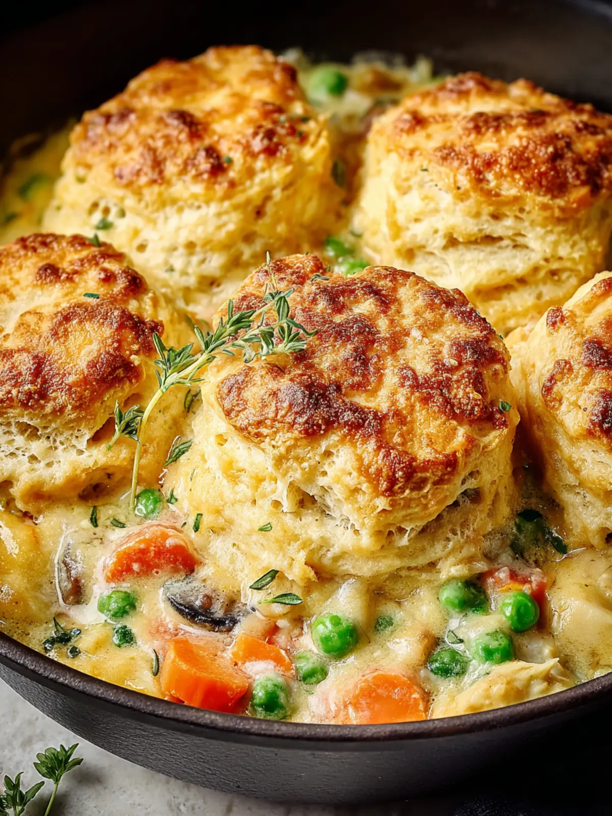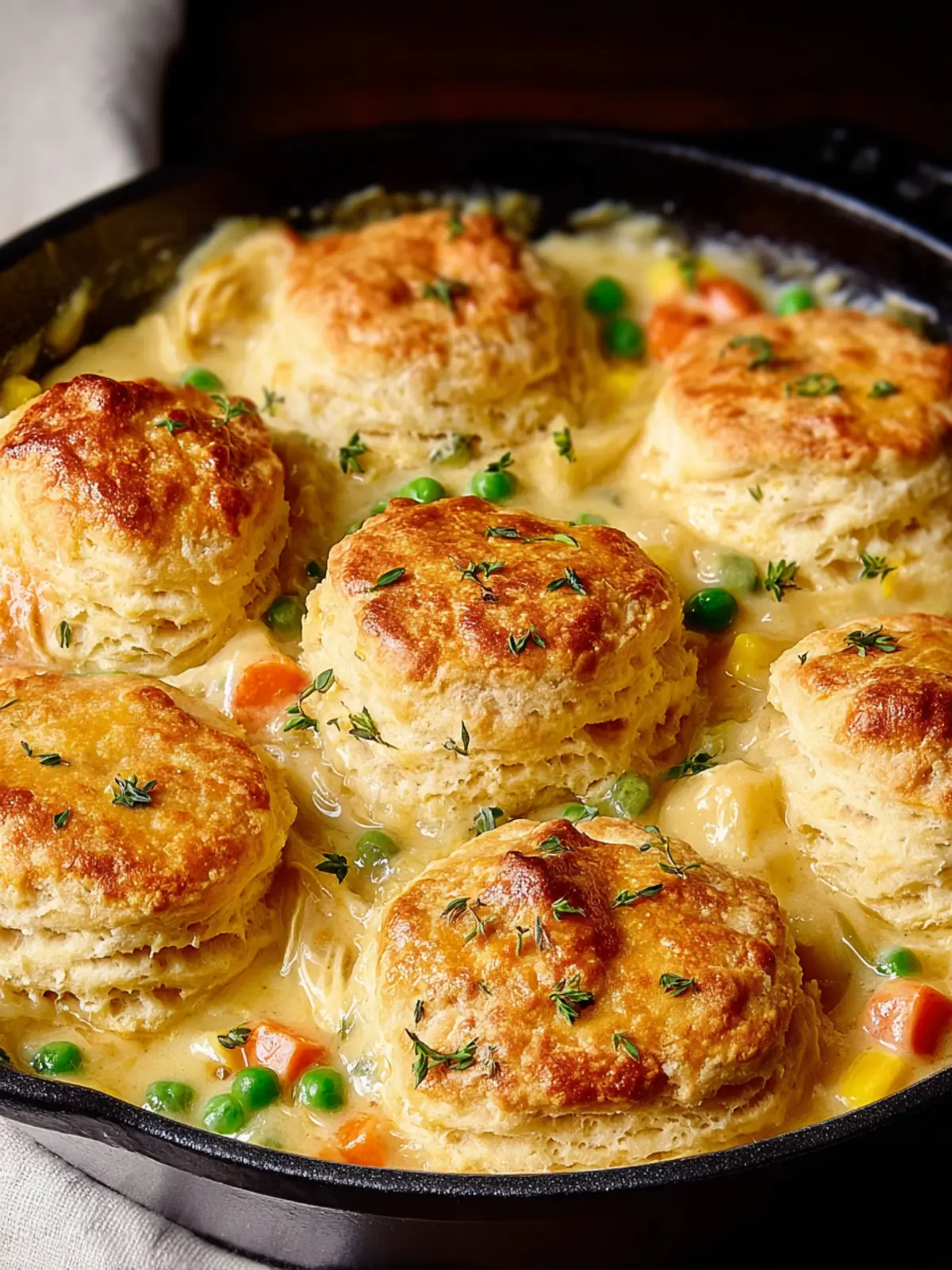 A comforting dish of tender chicken and vegetables, topped with golden biscuits.