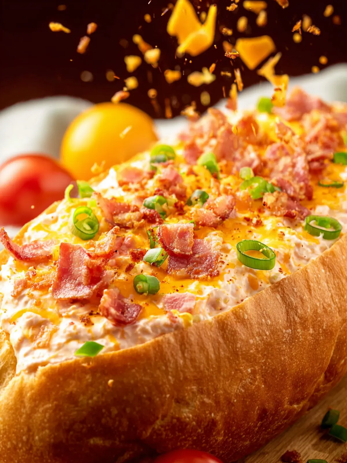 A delicious cheesy bread dip made with cheddar cheese, sour cream, and diced tomatoes.