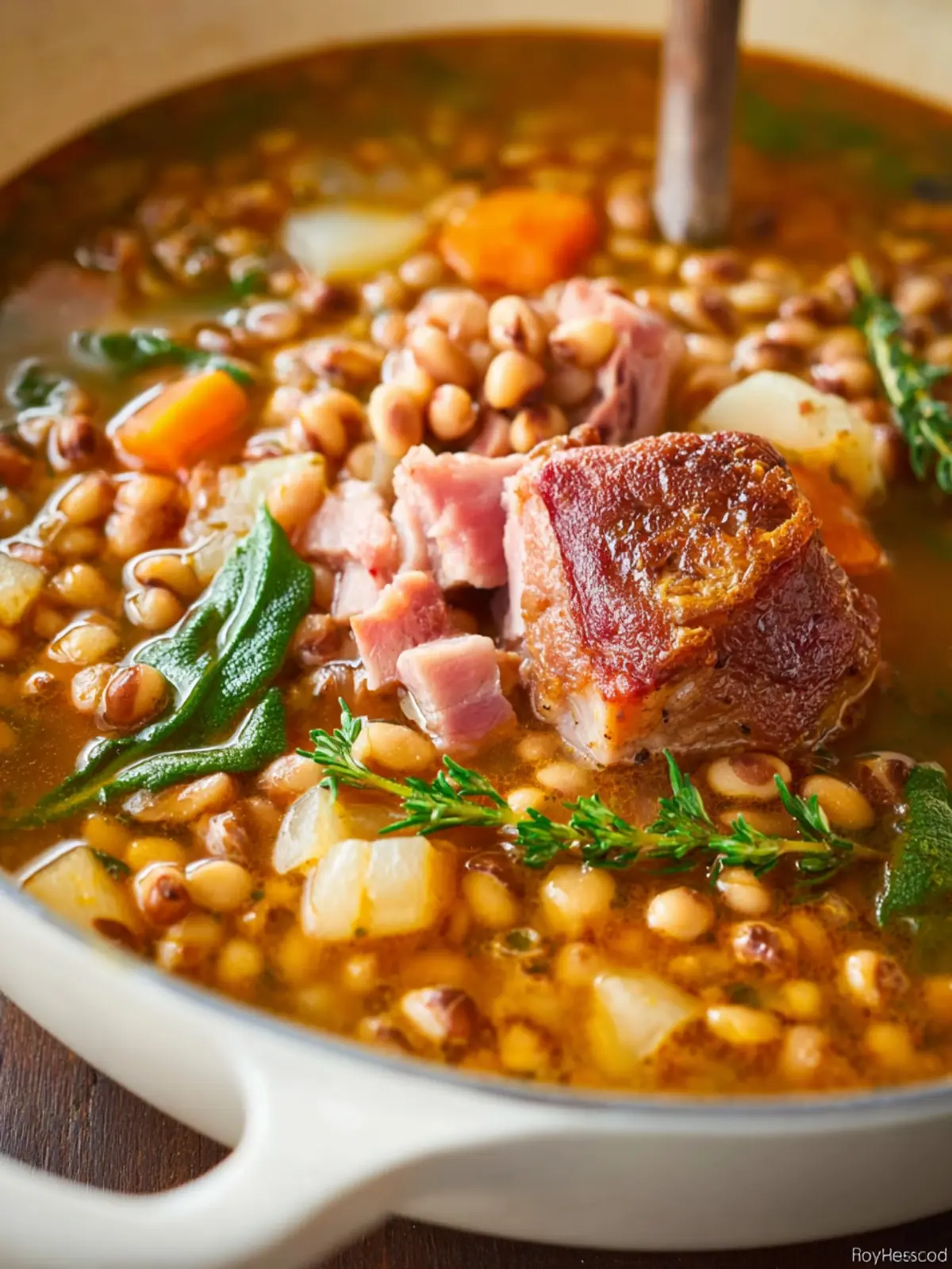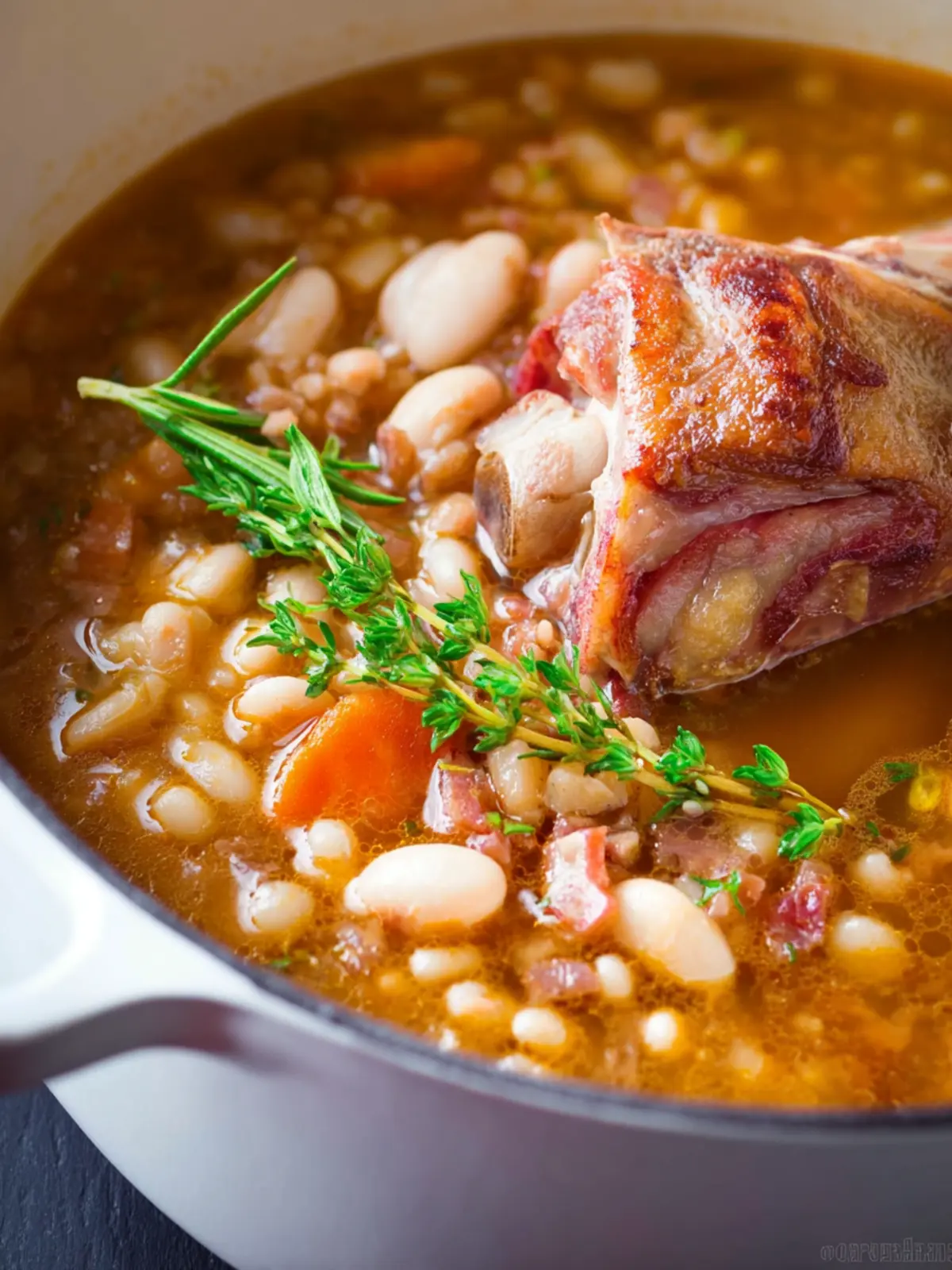 A hearty ham and navy bean soup that is perfect for a comforting meal.