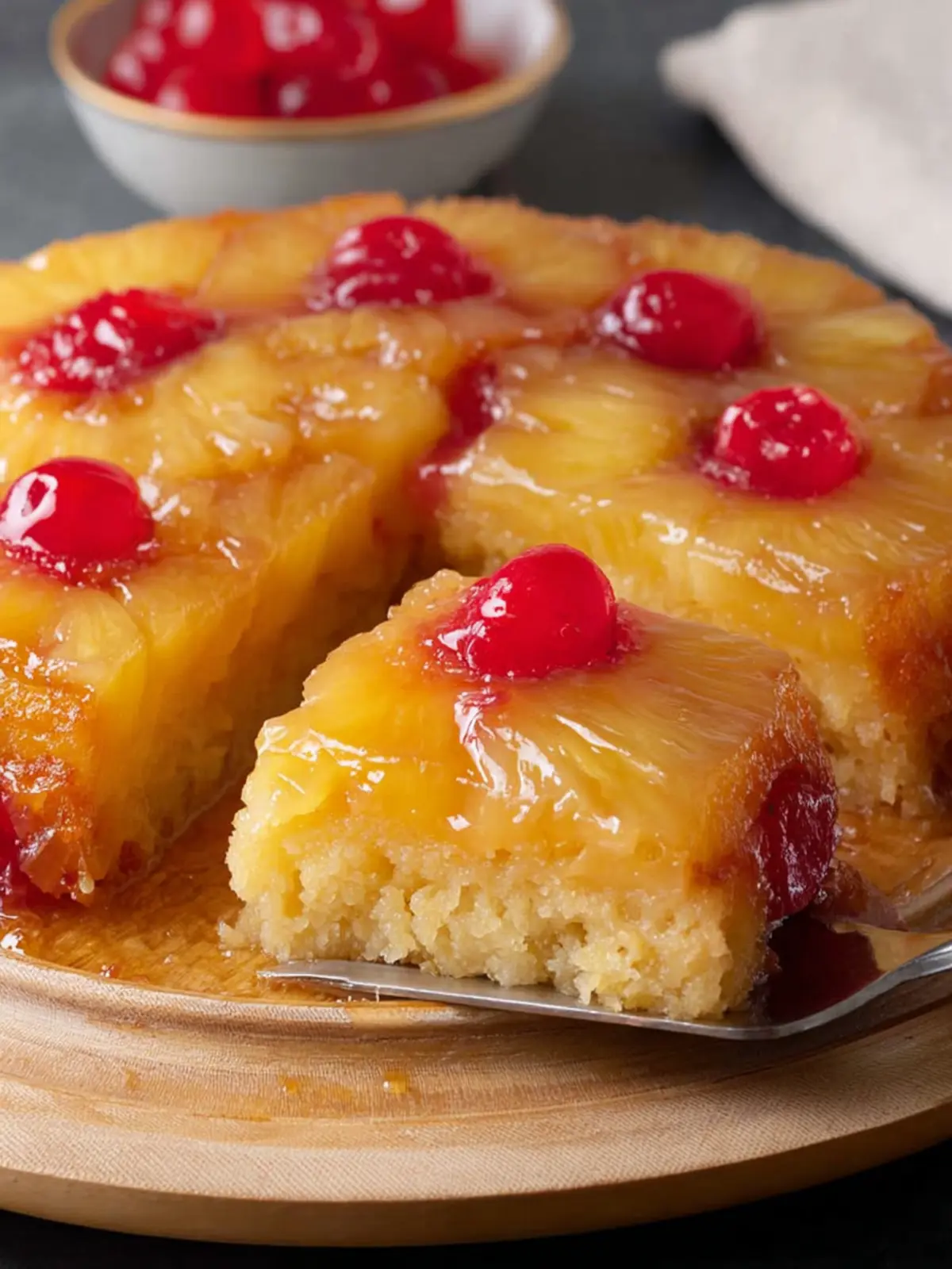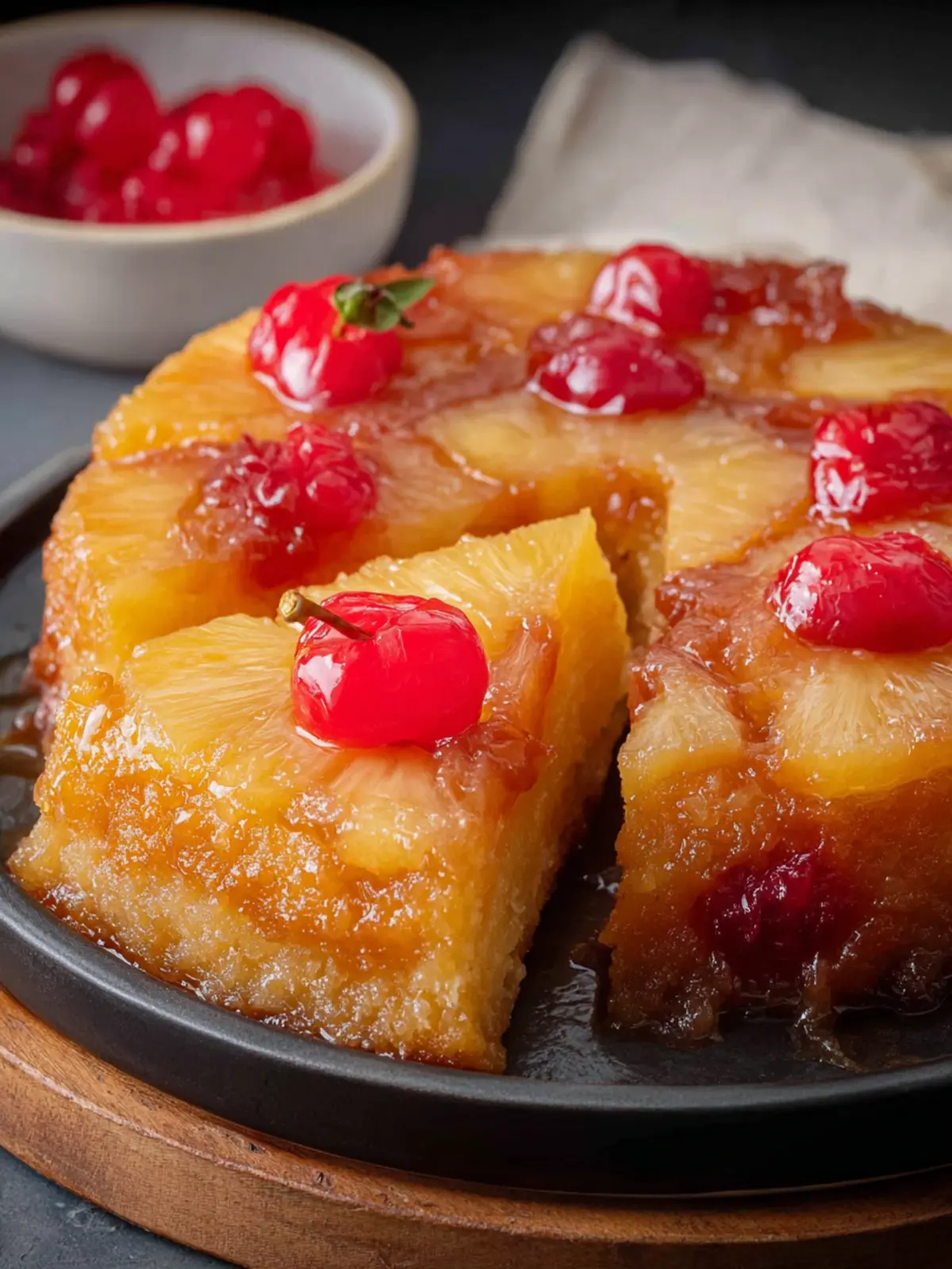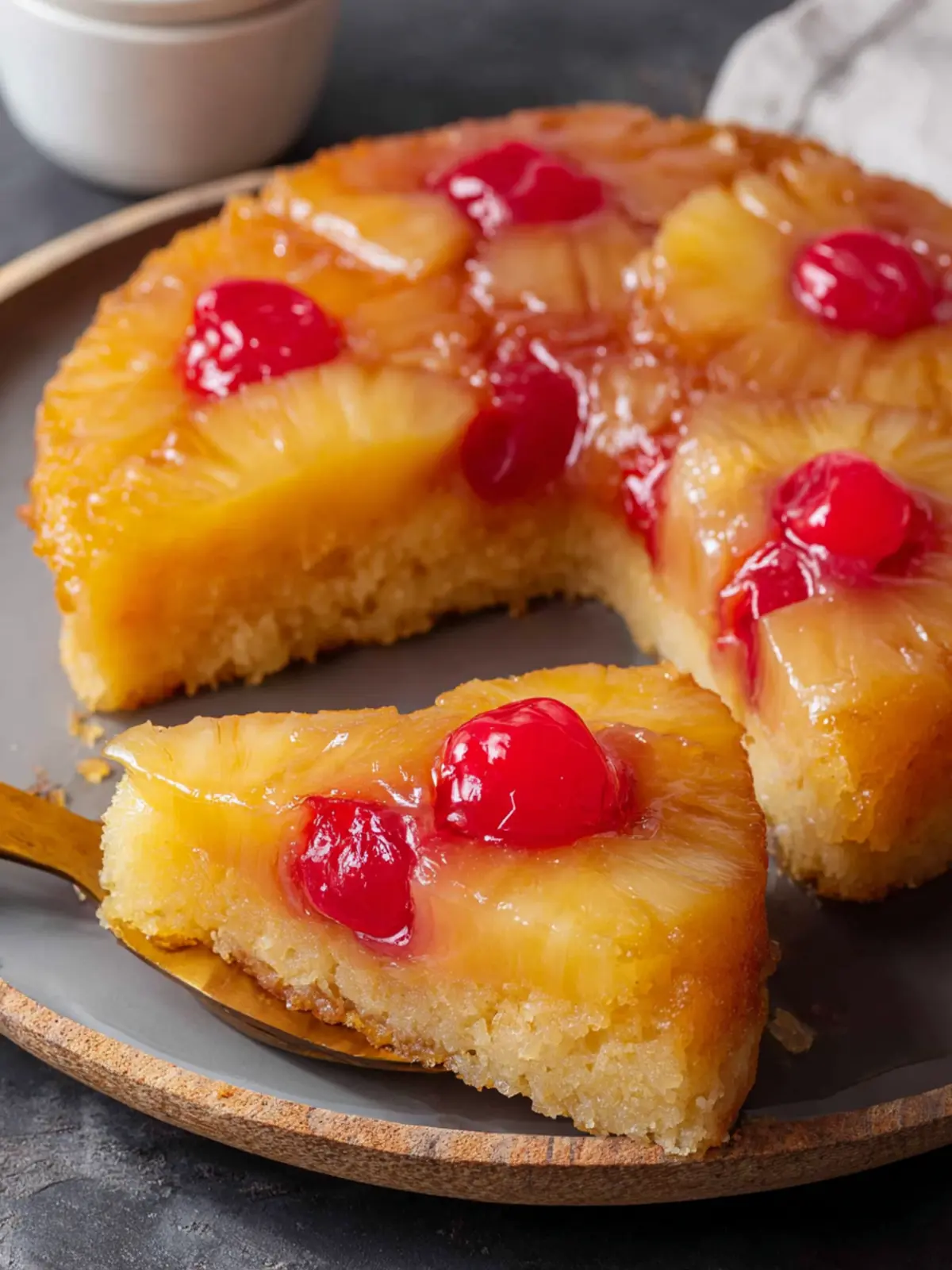 This delightful Pineapple Upside-Down Cake features a caramelized topping of pineapple rings and cherries, sitting atop a moist and fluffy cake.