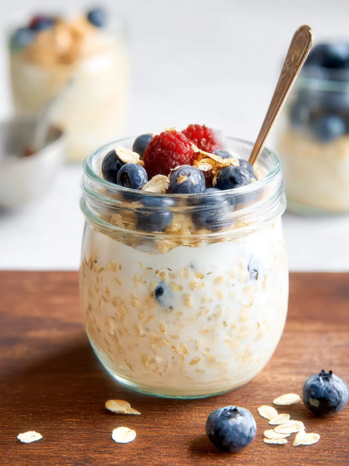 Getting started with your overnight oats takes about 10 minutes. You’ll mix your favorite ingredients, such as oats, milk, yogurt, and fruits, in a jar or bowl. It’s quick, fun, and allows you to be creative with flavors!