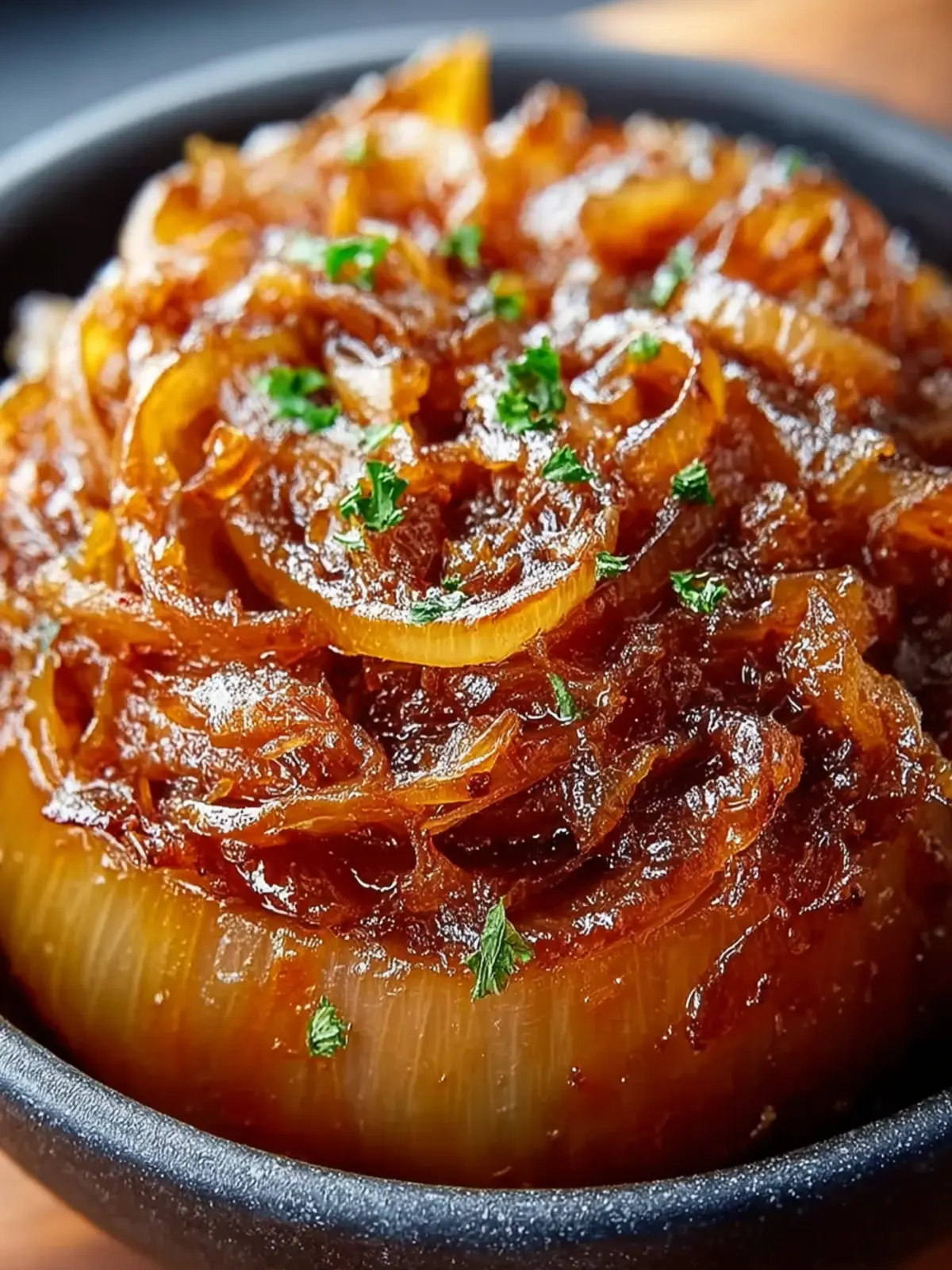 - Continue cooking for 30–40 minutes until onions are deep golden brown and soft.