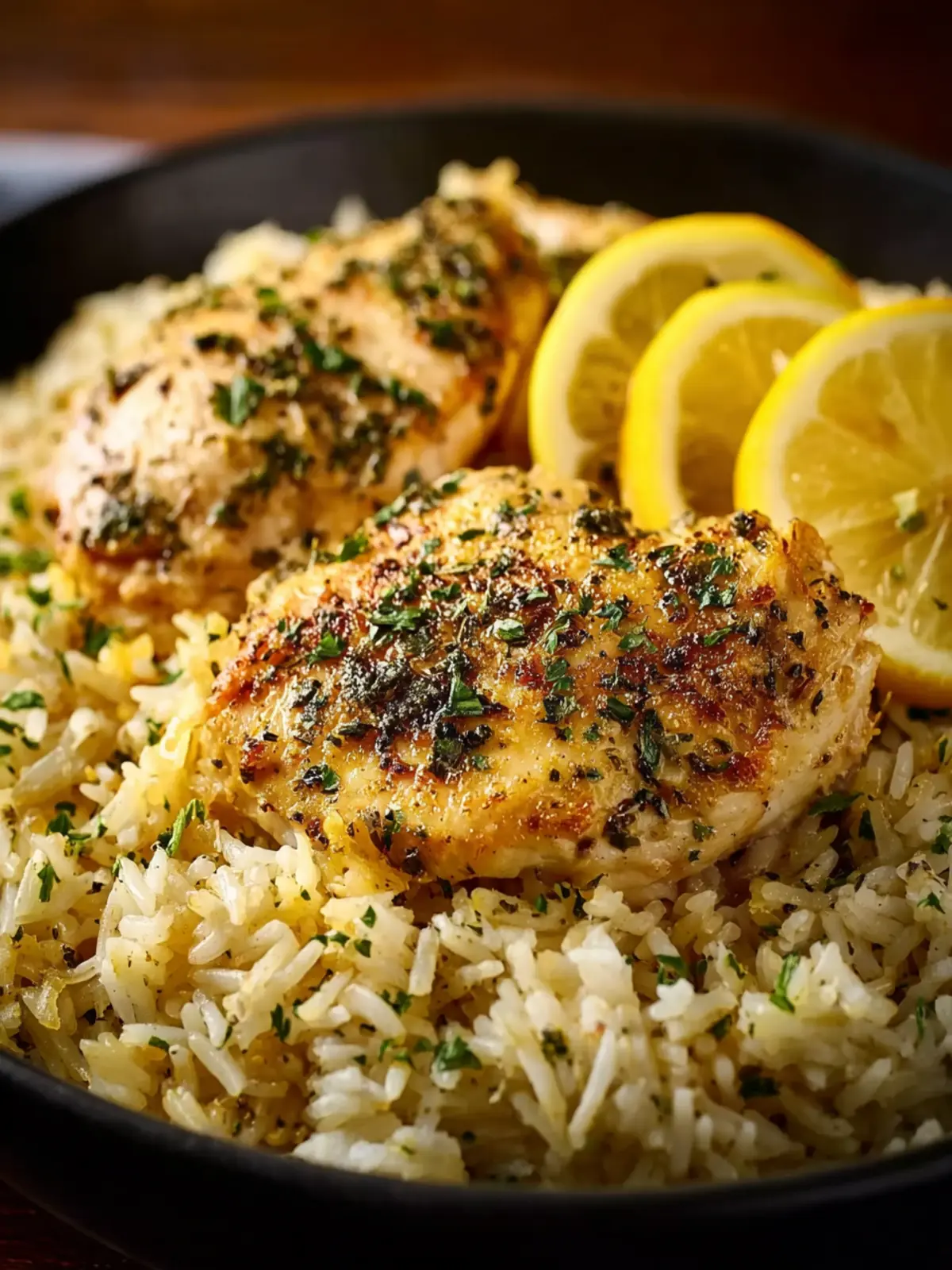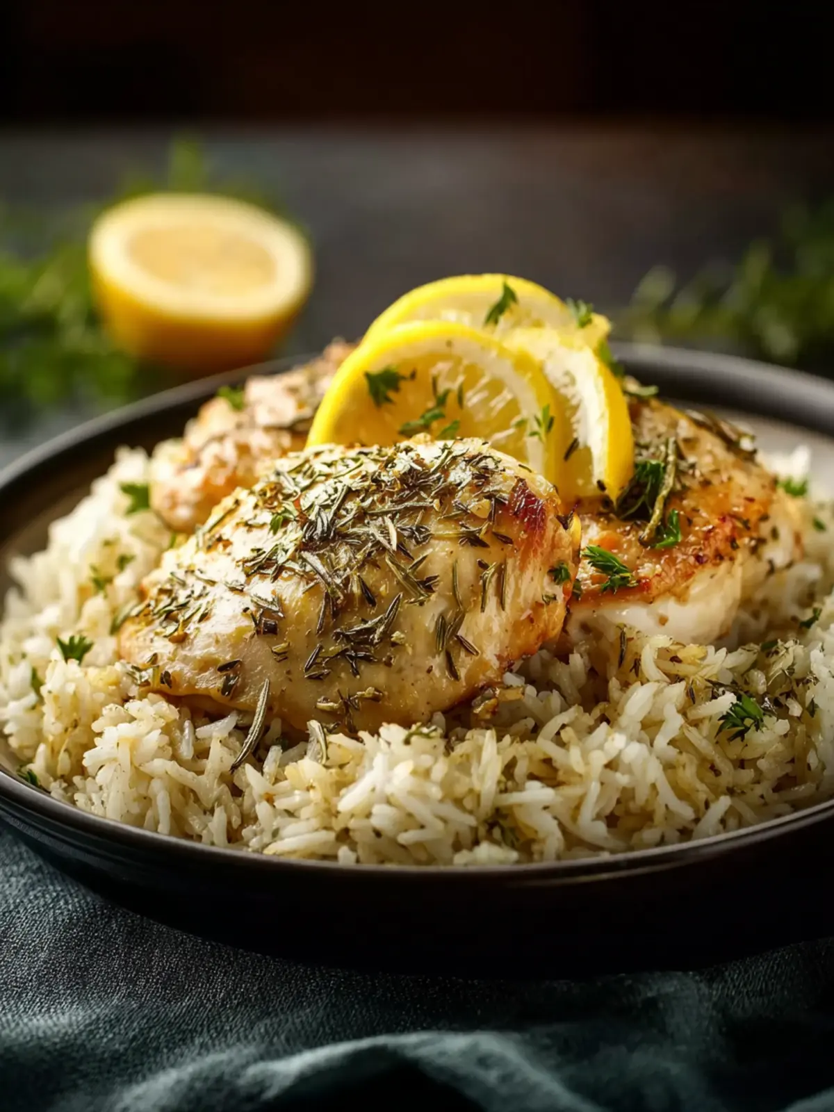 This dish features tender chicken breasts paired with flavorful herb-infused rice, brightened with lemon.