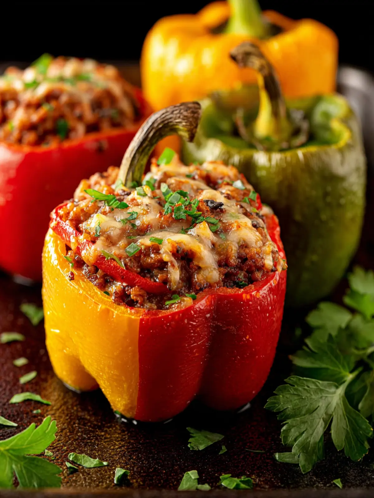 Delicious and colorful stuffed bell peppers filled with savory beef, rice, and cheese.