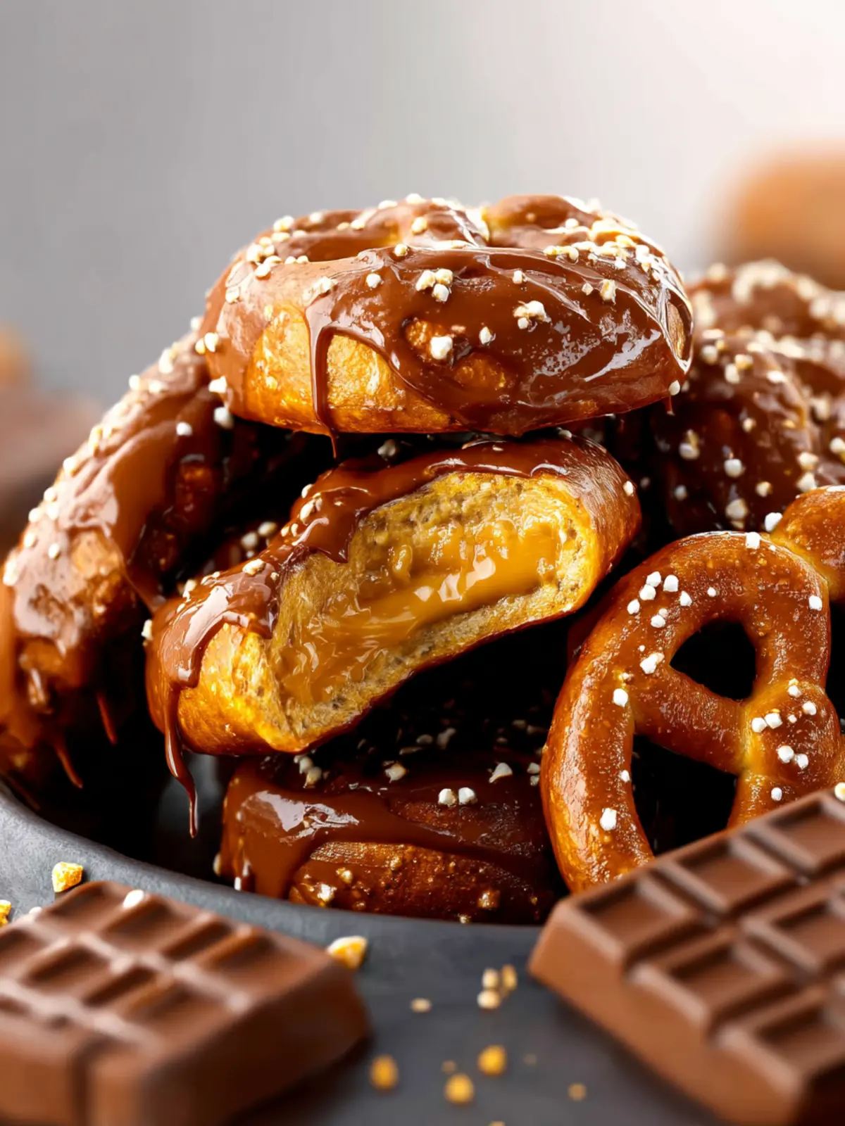 Melted chocolate takes these snacks to the next level. Dark chocolate pairs beautifully with the sweetness of caramel and the salty pretzel, tying all the components together in indulgent harmony.